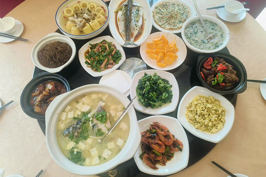 包吃住,餐饮食材新鲜。10人标准10菜1汤,不拼桌。早餐散客自助,人多桌早。