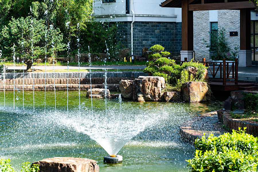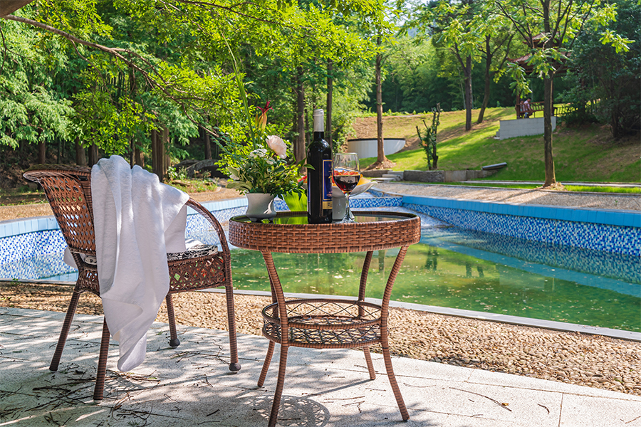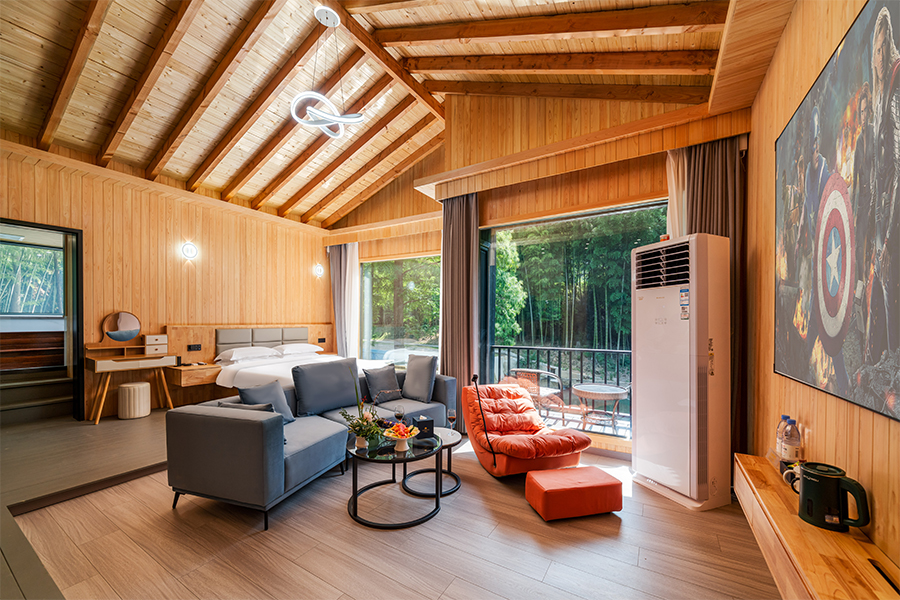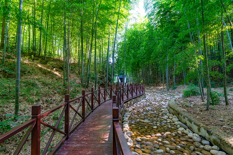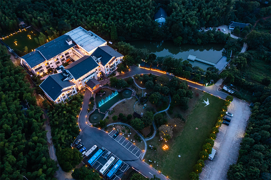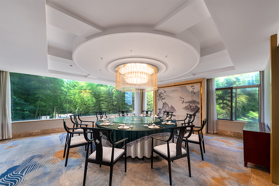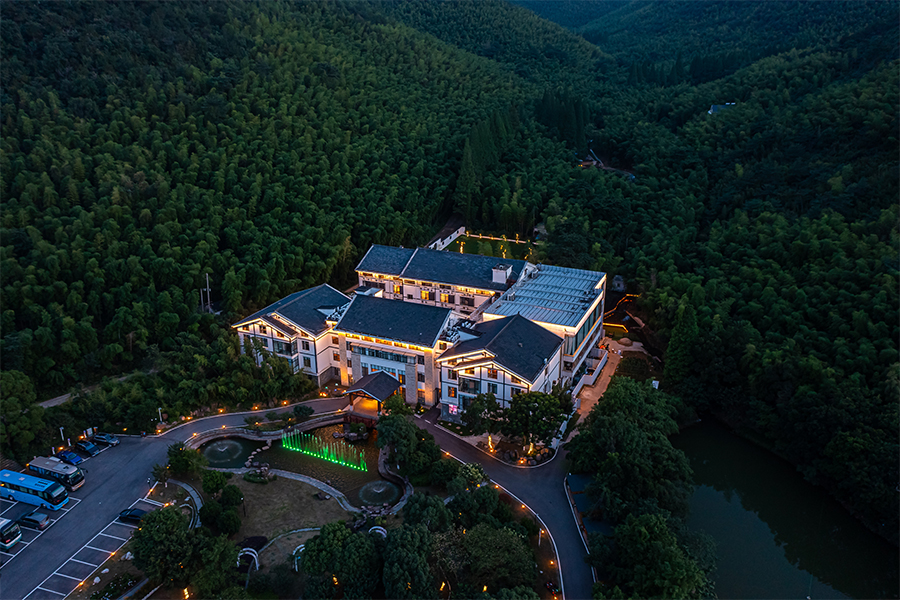 山庄三面环山,2600亩的竹林作为酒店配套的一部分,推窗而视的满山竹林及果林,是一个十分难得的天然氧吧,可以深氧净肺,使人心旷神怡。